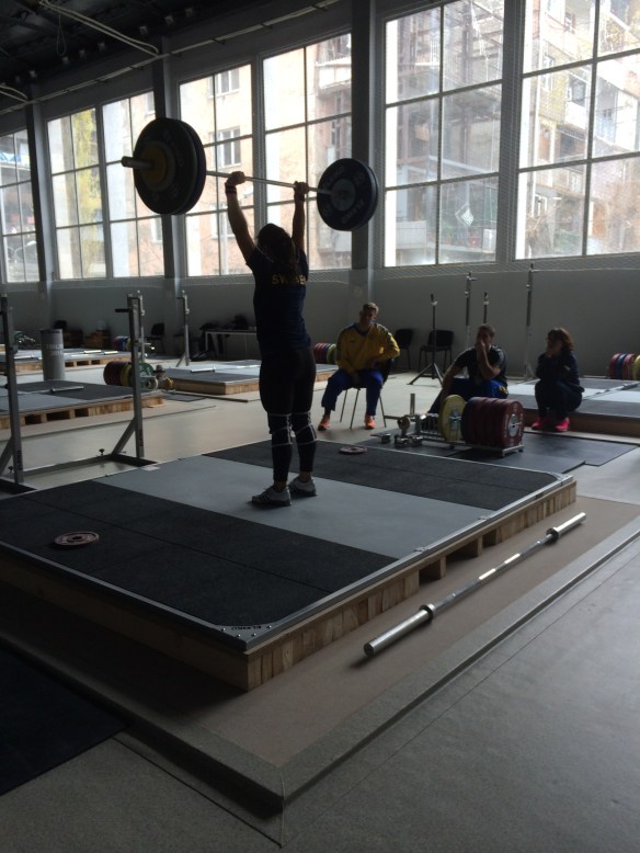 Uppvärmingen kändes så satans bra. Jag kände mig snabb och stark och lyften bara flög upp. Ingångsvikten i ryck höjde vi från 81 till 83 kg, en vikt som jag aldrig har gått in på tidigare men som jag känner mig säker på. Tanken var lite att försöka ”samla” ihop så många kg som möjligt i rycken och sedan satsa lite mer i stöten. 83 rycket kändes så lätt! Och 86 kändes ännu bättre. Jag var verkligen säker på att jag även skulle ta 88 men tyvärr inte den här gången.